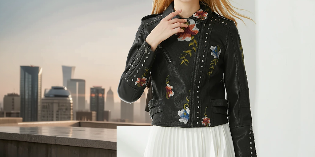Spring Autumn Women Faux PU Leather Jacket Casual Lady Rivet Floral Embroidery Leather Jacket