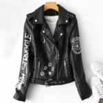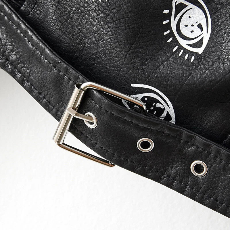 Fitaylor Autumn Winter Women Graffiti Print Faux Leather Jacket Lady Moto Bike PU Leather Coat Casual Rivet Jacket with Belt