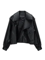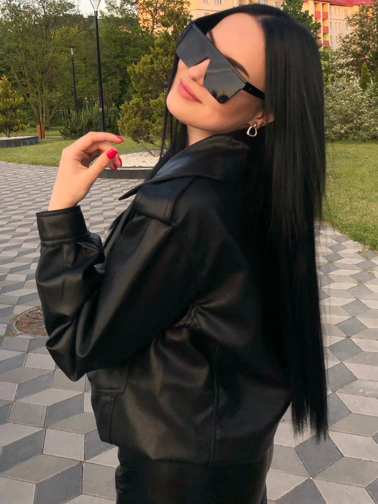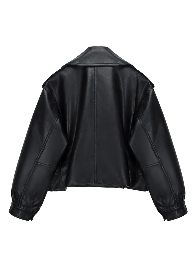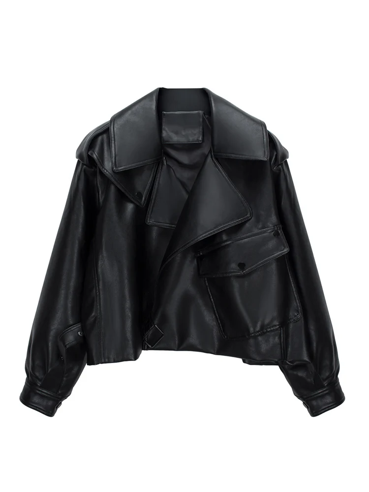 Lady High Street Women Lapel Loose Pu Faux Leather Short Jacket Spring Autumn Female Big Pocket Belt Coat Moto Biker Outwear