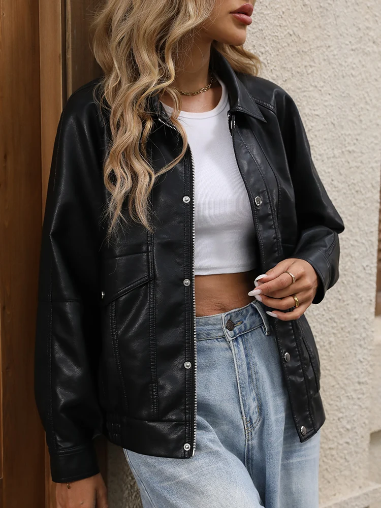 Lady Women Vintage Loose Zipper Faux Leather Fur Jacket Spring Autumn Female Streetwear Big Pocket Coat Outwear