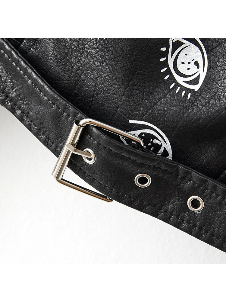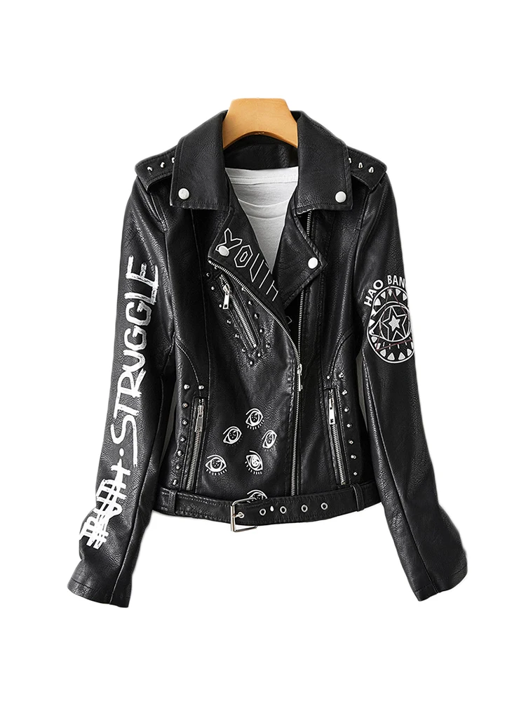 Lady Spring Women Graffiti Print Pu Faux Leather Short Jacket Streetwear Female Retro Slim Zipper Moto Biker Coat Outwear