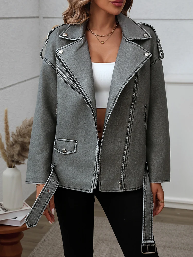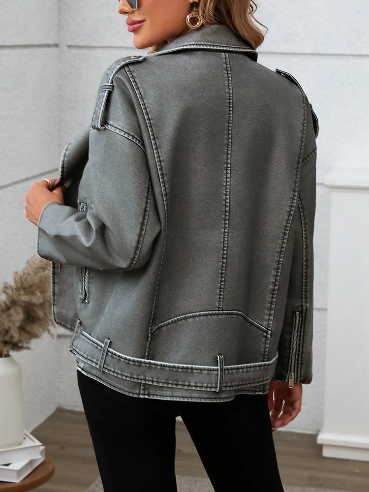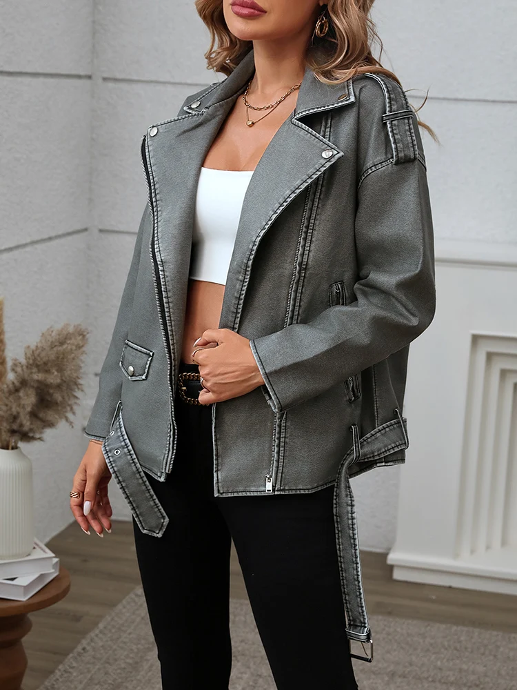 Lady Streetwear Female Retro Loose Pu Faux Leather Jacket Spring Autumn Women Zipper Belt Coat Moto Biker Outwear