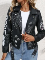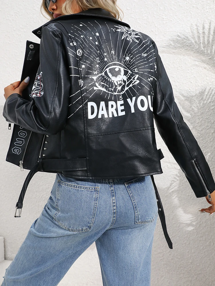 Lady Women Retro Short Graffit Print Slim Pu Faux Leather Jacket Streetwear Female Zipper Belt Coat Moto Biker Outwear