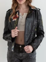 Lady Women Vintage Floral Print Embroidery Slim Fit Short Pu Faux Leather Jacket Streetwear Female Zipper Rivet Coat Outwear
