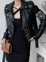 Lady Women Vintage Graffiti Print Slim Pu Faux Leather Jacket Streetwear Female Moto Biker Zipper Belt Short Coat Outwear